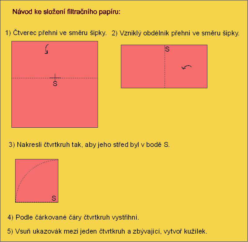 Skleničku naplň do jedné třetiny vodou a přisyp půl kávové lžičky písku a směs zamíchej. Z pijáku si připrav podle návodu na obrázku filtrační papír. Ten z vnější strany ovlhči vodou, aby lépe přilnul ke stěnám nálevky. Pak vzniklou suspenzi nalij do nálevky posazené do sklenice. Po ukončení pokusu si prohlédni filtrační papír a kapalinu ve sklenici pod nálevkou.