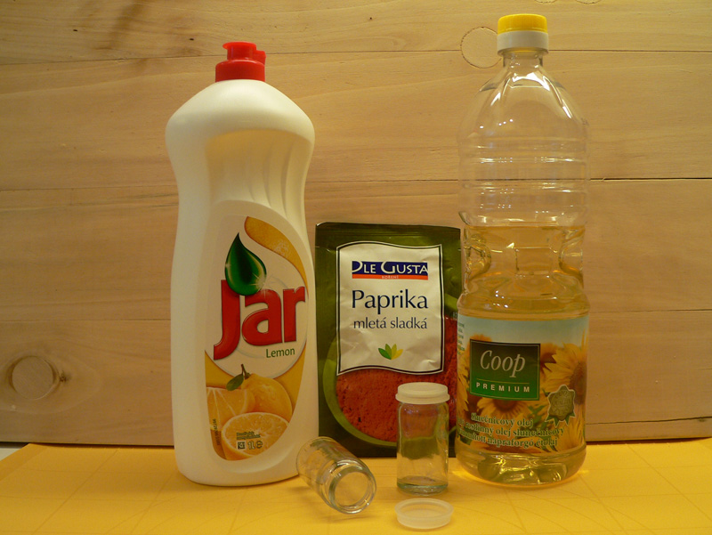 Do obou lahviček nalij do jedné třetiny vodu, pak přidej olej obarvený červenou paprikou. Do druhé lahvičky přidej saponát. Obsah obou zazátkovaných lahviček protřepej a pozoruj.