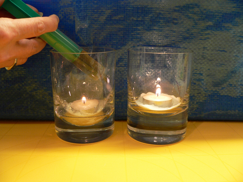 Do každé sklenice vlož doprostřed čajovou svíčku. Kolem ní nasyp jedlou sodu. Svíčky zapal. Do stříkačky naber ocet a pomalu ho stříkej jen do jedné sklenice. Pozoruj, co se stane.