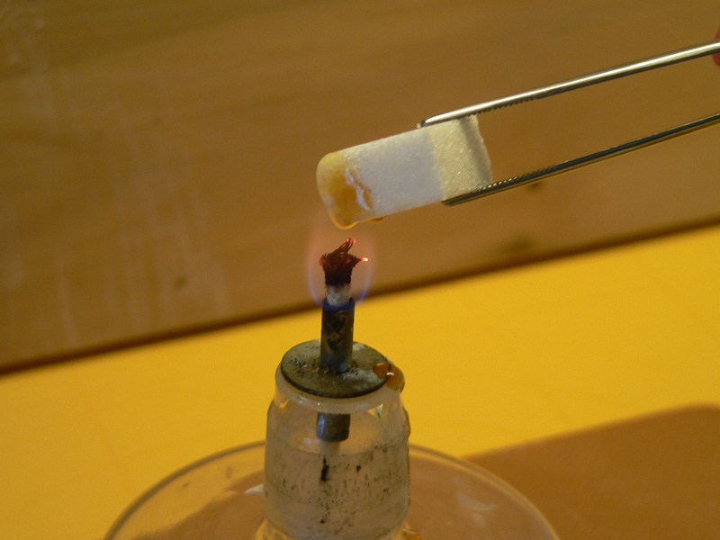 Vezmi pinzetou kostku cukru a podrž ji v plamenu lihového kahanu. Hoří kostka cukru? Nasyp na tuto kostku popel z cigarety a znovu umísti do plamene kahanu. Co pozoruješ?