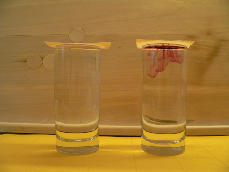 Naplň jednu sklenici po okraj studenou vodou, druhou teplovou vodou. Na každou polož piják tak, aby se dotýkal vodní hladiny a nasyp na něj několik zrnek manganistanu draselného (KMnO4). Pozoruj.