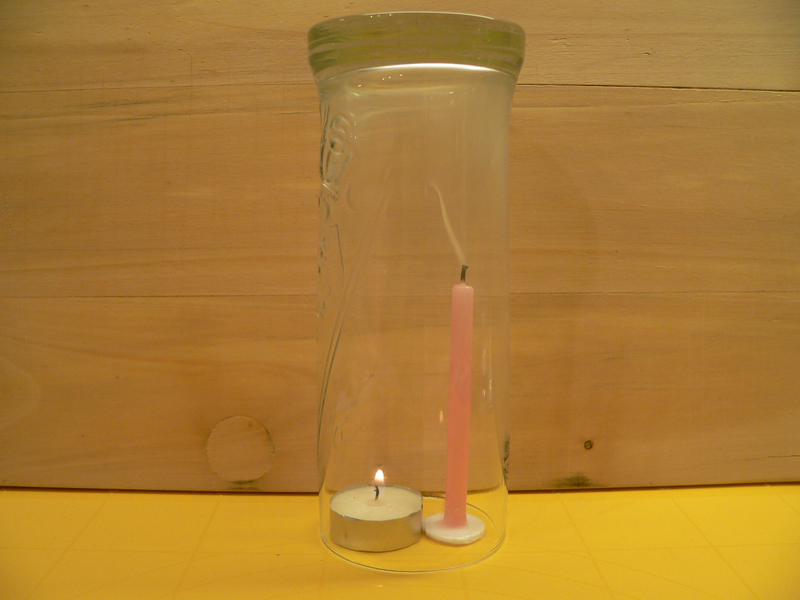 Obě svíčky zapal a přiklop je sklenicí. Pozoruj hořící svíčky.