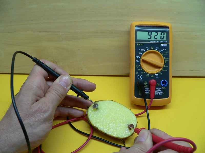Do jablka vsuň dva pozinkované hřebíky a dotýkej se každého jedním vodičem. Změř napětí mezi elektrodami, které představují hřebíky. Jeden pozinkovaný hřebík nahraď měděným a opět zjisti napětí na elektrodách. Pokus opakuj s bramborem a citronem.