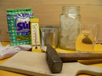 Led vlož do igelitové tašky a kladívkem ho na kuchyňském prkénku roztluč na jemnou ledovou drť. Na prkénko nalij trochu vody a postav na něj plechovku s ledovou drtí a přidej k ní kuchyňskou sůl, aby byl poměr ledu a soli 3 : 1. Do směsi vlož teploměr a sleduj teplotu. Pevně přidržuj plechovku k prkénku a současně směs míchej lžící. Za 5 minut se pokus oddělit plechovku od prkénka.