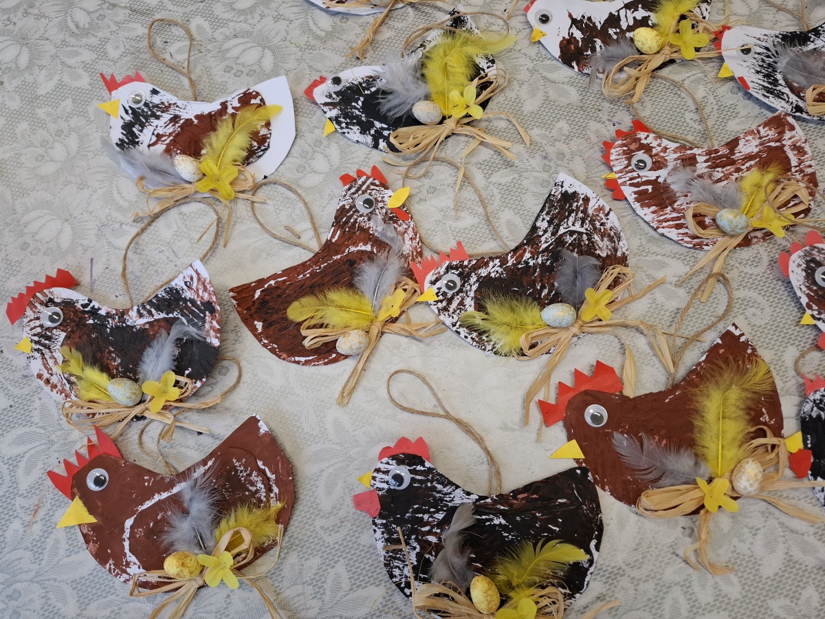 Před Velikonocemi jsme si povídali o velikonočních zvycích, vyráběli jsme různé dekorace, slepičky, kuřátka z papírových talířů a skořápky metodou kašírování.
